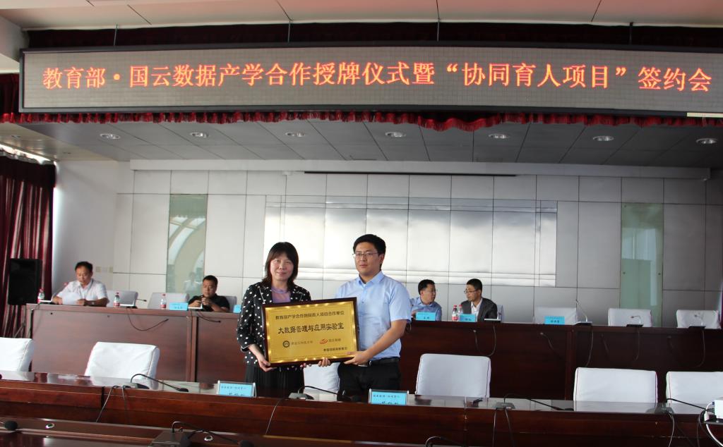 在签约授牌环节中,管理学院郭红副院长与王一民总监签署了管理学院与江苏国云数据产学合作协同育人项目协议并进行了授牌仪式。