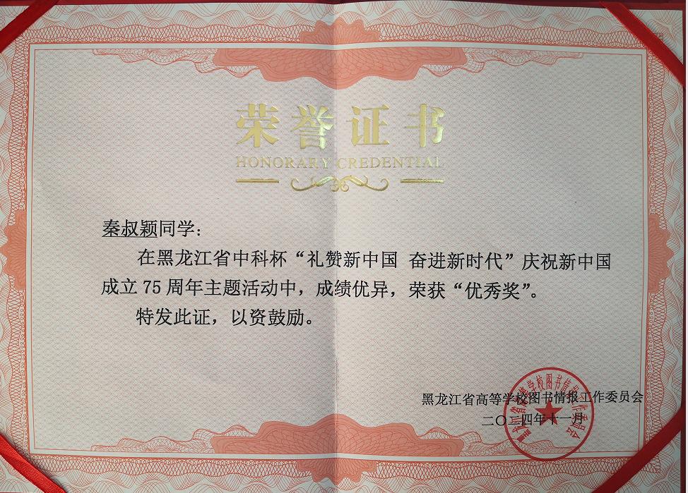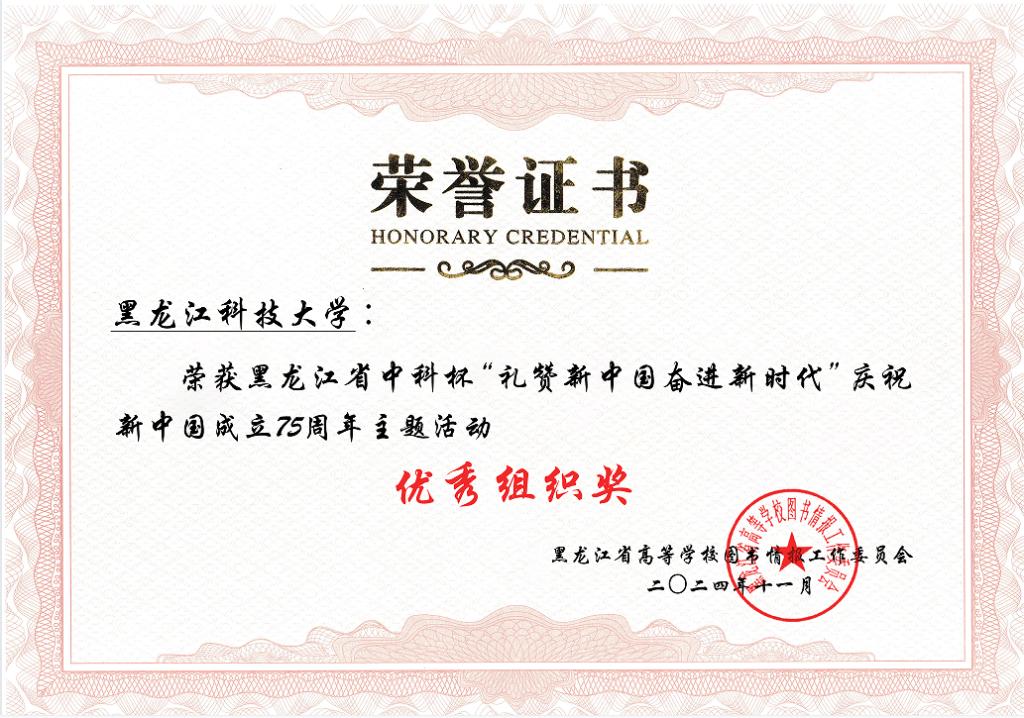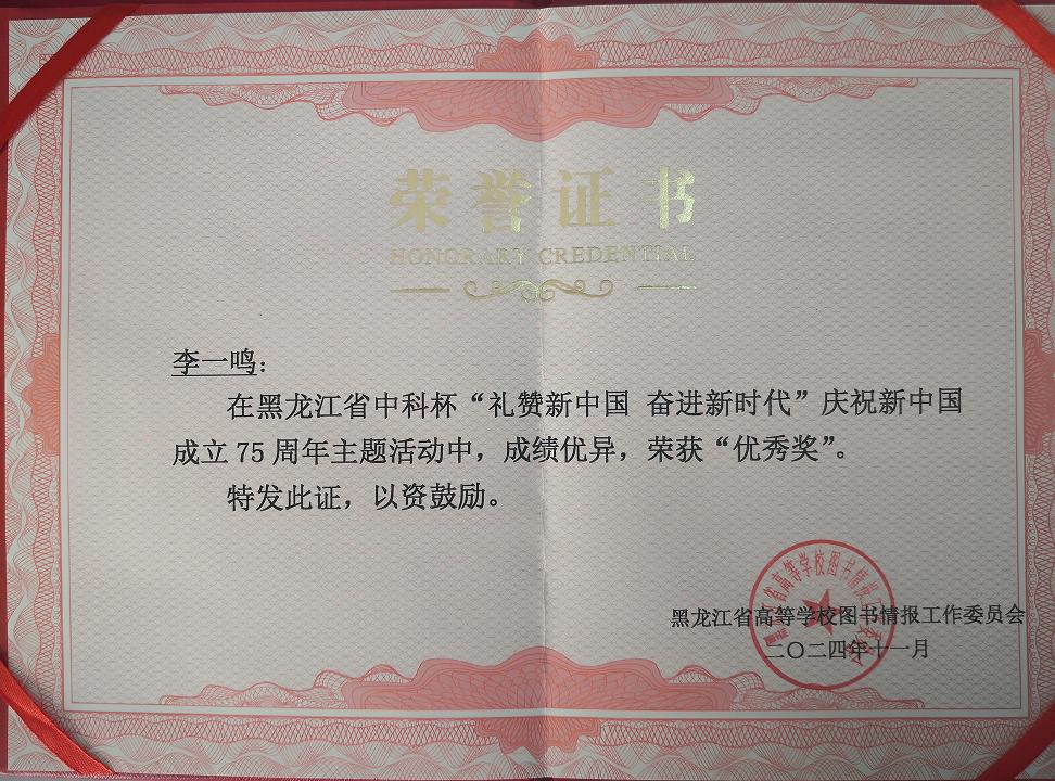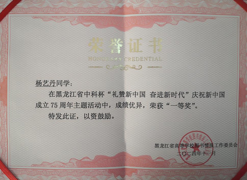近日,由黑龙江省高等学校图书情报工作委员会主办,中科软股教育科技(北京)股份有限公司协办的黑龙江省中科杯“礼赞新中国 奋进新时代”庆祝新中国成立75周年主题活动获奖名单公布。米兰(中国)一站式服务平台研究生学院杨艺丹获学生组一等奖、环境与化工学院秦叔颖获学生组优秀奖,李一鸣获教师组优秀奖,学校获得优秀组织奖。