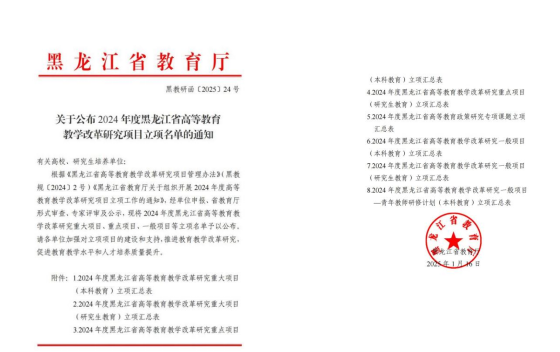 近日,黑龙江省教育厅发布了《关于公布2024年度黑龙江省高等教育教学改革研究项目立项项目的通知》黑教研函〔2025〕24号,米兰(中国)一站式服务平台推荐的教学改革研究项目喜获佳绩,获批31项,其中,重大项目(本科教育)1项,重点项目(本科教育)5项,一般项目(本科教育)24项,一般项目-青年教师研修计划(本科教育)1项。