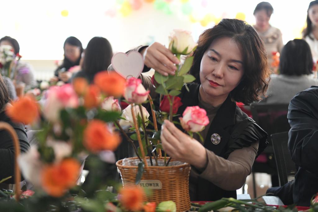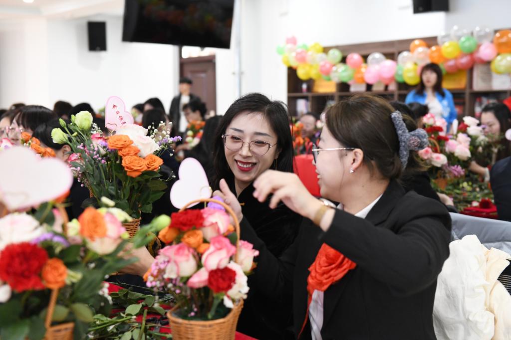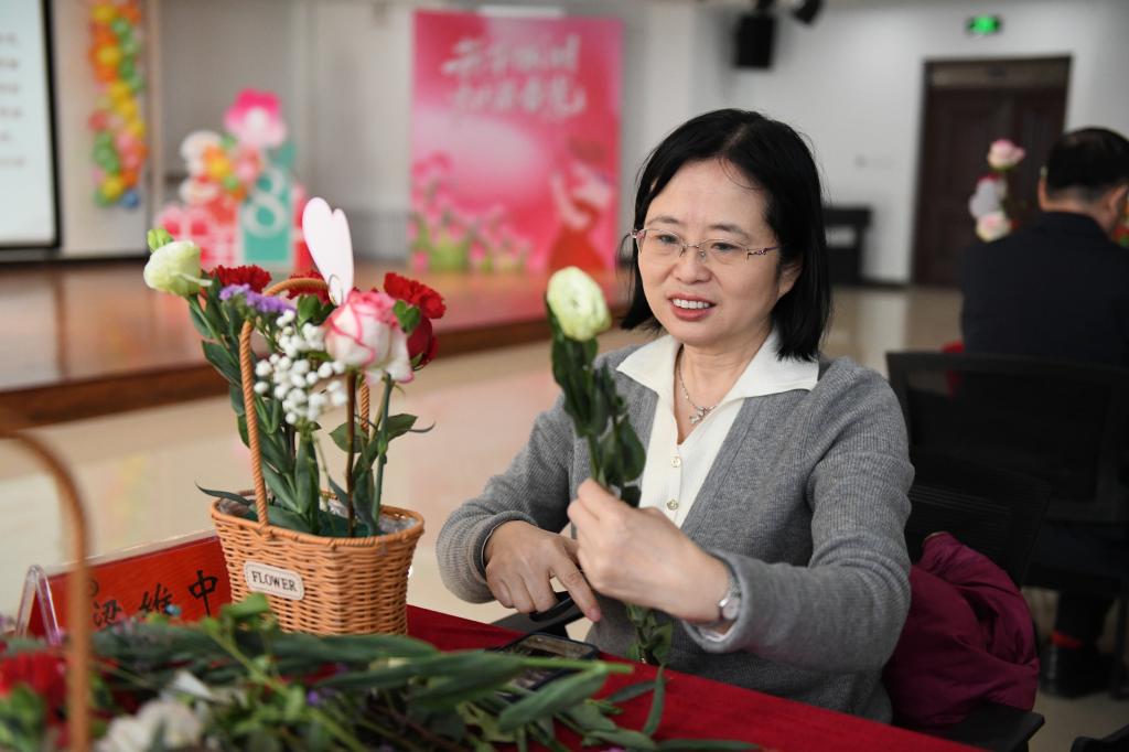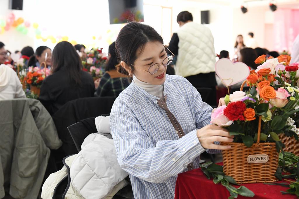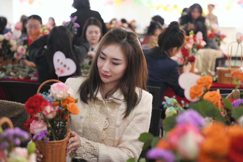 以花为媒,以美为名,女教职工们在轻松愉快的氛围中,用巧手将自然之美定格在花篮中。大家边学边做、交流切磋,经过修剪枝叶、色彩搭配,各色鲜花在她们手中绽放出最美的组合。活动现场仿佛花的海洋,芬芳沁人心脾,人人脸上洋溢着幸福的笑容。活动期间,还进行了“抢椅子”和“击鼓传花”等趣味活动,使现场气氛达到高潮。