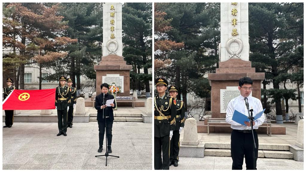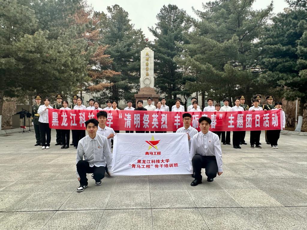 苍松翠柏掩映下的烈士陵园庄严肃穆,一座座烈士纪念碑巍然耸立。团日活动上,在场师生齐唱国歌、集体默哀、敬献鲜花,向民族独立解放、国家繁荣富强而牺牲的英雄烈士致以最崇高的敬意。“青马班”班主任齐曦彤为学员们讲授了《丰碑下的微团课》,引导青年学生传承红色基因,赓续奋斗精神,坚定不移听党话、跟党走。学员代表理学院数学22-2班迟佳铭、研究生学院研23-30班栾贺宇分别以《承载东北抗联精神的靰鞡》《冰天雪地矢壮志、白山黑水铸英魂》为题做了心得分享。学员代表安全22-3班齐天赐向全体“青马”学员发出倡议,要把爱国情、强国志、报国行融入血脉,奋力书写为中国式现代化挺膺担当的青春篇章。最后,全体师生重温入团誓词,整齐的列队,高举的右拳,铿锵的誓言响彻陵园。
