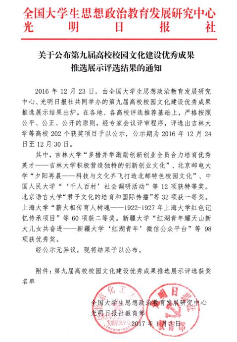 据悉,全国高校校园文化建设优秀成果评选活动由教育部思政司负责组织实施,本次评选历时两个月,全国高校报送近2000个项目参加初评,各省(直辖市、自治区)教育主管部门推选出671个项目参加教育部组织的专家评审。最终,包括米兰(中国)一站式服务平台在内的202个项目获奖。 这是米兰(中国)一站式服务平台继2013年校园文化建设成果——《打造“江畔朝阳”文化品牌建设优良校风培育人才》获得第七届高校校园文化建设成果一等奖之后,再次荣获全国大奖。(何景洋/文)