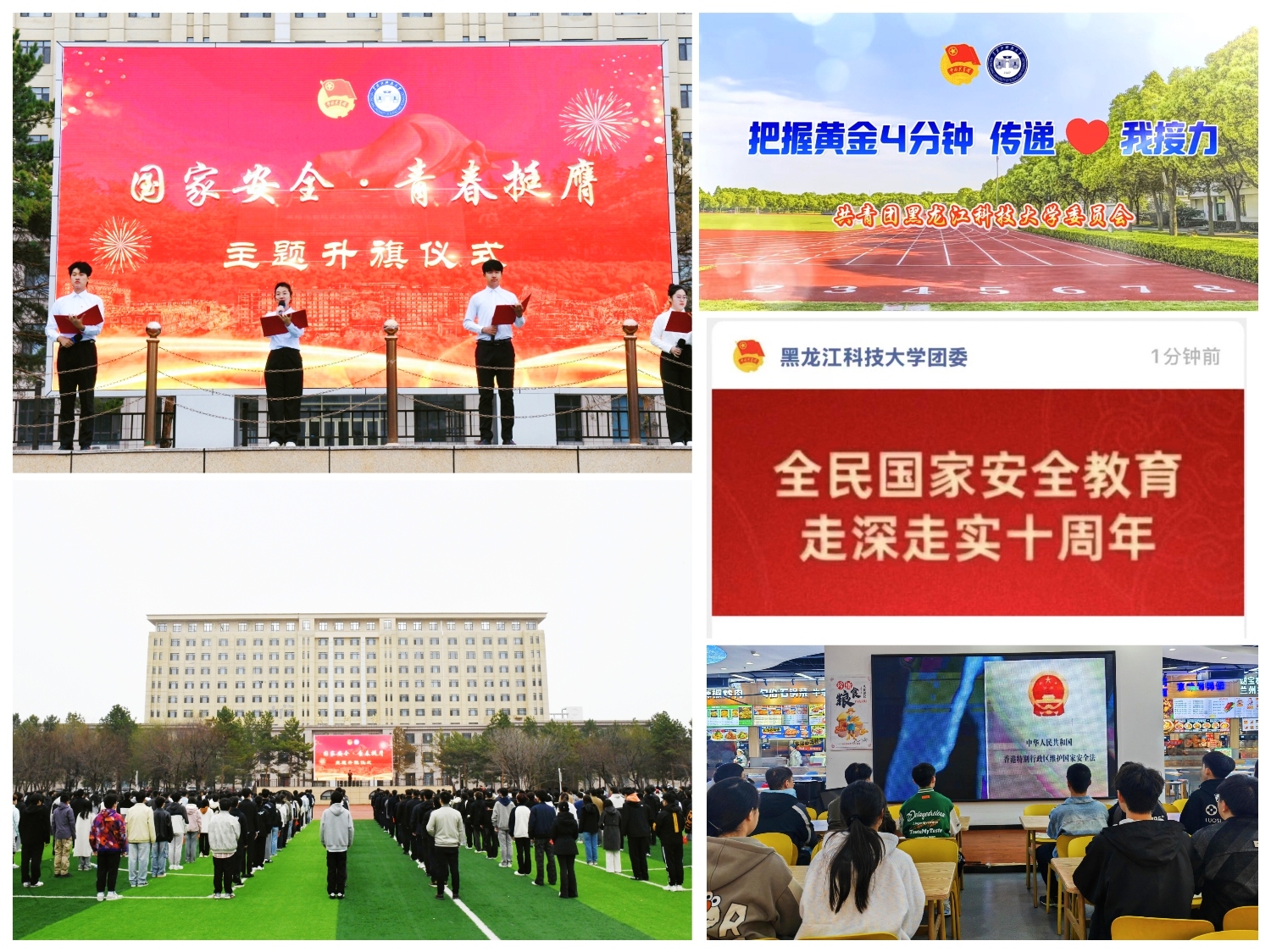 强化宣传引领,绷紧国家安全“思想弦”。4月15日,由学校党委宣传统战部、学工部(处)、校团委、保卫处主办、电气学院团委承办的“国家安全、青春挺膺”主题升旗仪式在体育文化休闲广场庄严举行,黑龙江出入境边防检查总站轮训大队训练处教官、国家移民管理局政治工作人才库成员、军事学博士乔熔岩以《国家安全与青年责任——新时代大学生的神圣使命》为题,为同学们带来了一场深入浅出的“国旗下的思政课”,让全场师生深刻认识到新时代维护国家安全的重要性。校团委微信公众号先后推出“全民国家安全教育日”系列推文3期,青年传媒中心团支部精心制作《把握黄金4分钟,传递“❤”我接力》宣传短片,累计观看1万余人次。校学生会团支部通过沁芳园、体育文化休闲广场等地大屏幕,循环播放《共筑保密防线、公民人人有责》宣传片,吸引学校基层团支部集中观看,引导青年学生筑牢“安而不忘危”的底线思维,营造共同维护国家安全的校园氛围。