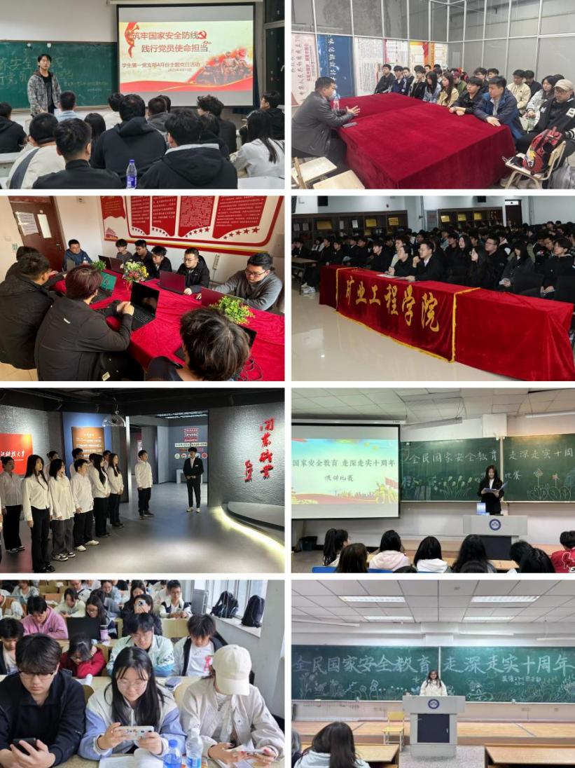 在特色活动中发挥专业优势,着力铸牢学生国家安全意识。机械学院开展“筑牢国家安全防线 践行党员使命担当”主题党日活动,以党员带动全体学生,共筑校园安全防线。计算机学院将国家安全教育引入学院“一站式”社区建设,通过邀请行业专家入驻,定期开展安全讲座等活动,提升学生维护国家安全的责任意识与专业素养。理学院深耕“沉浸式教育”品牌建设,组织学生走进校史馆、矿业馆、地质馆,将校史校情与学科发展史转化为涵养国家安全意识的生动课堂。环化学院立足专业特色,精心打造《国家安全教育课》网络直播课程,实现专业教育与国家安全教育的有机融合。建工学院举办“建筑安全与国家安全”主题沙龙,引导学生深刻认识到建筑行业在维护国家安全中的特殊使命。矿业学院开展“全民国家安全教育日”教育培训活动,以普法宣讲铸牢学生国家安全意识。经济学院、外国语学院开展“全民国家安全教育 走深走实十周年”主题演讲比赛,选手们用鲜活的故事、详实的数据,展现新时代大学生对国家安全的深刻思考。