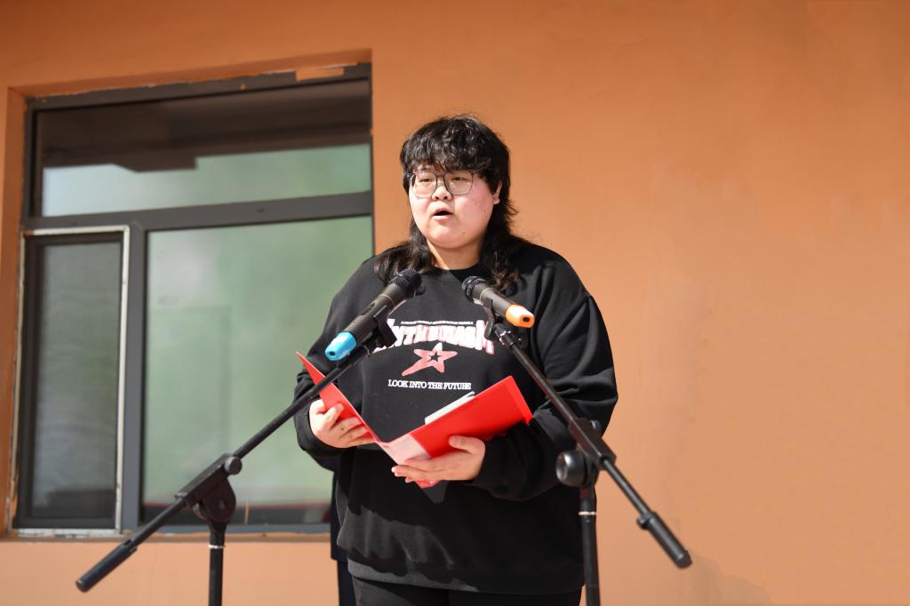 体育部教师高欣程代表全体裁判员、学生白艺代表全体运动员庄严宣誓,承诺将在比赛中恪守体育道德,遵守竞赛规则,赛出水平,赛出风格。