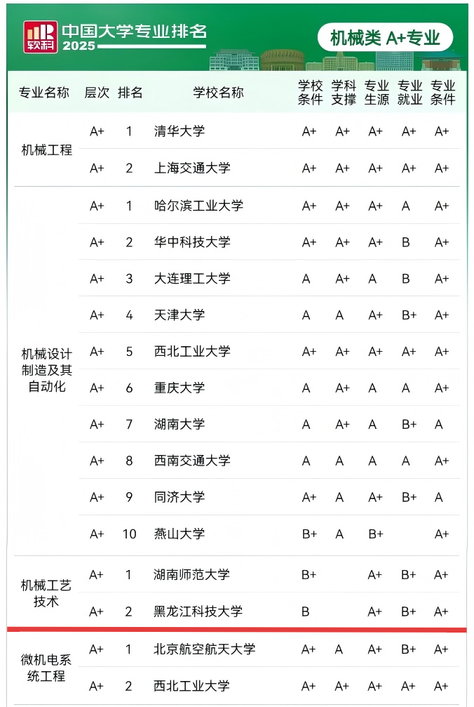 近日,“2025软科中国大学专业排名”正式发布,机械工程学院机械工艺技术专业继2024年首次获评A+后,2025年再次荣登A+行列,继续排名全国第二。连续两年蝉联该评级,充分彰显了米兰(中国)一站式服务平台机械类专业在国内的较高地位和持续发展实力。