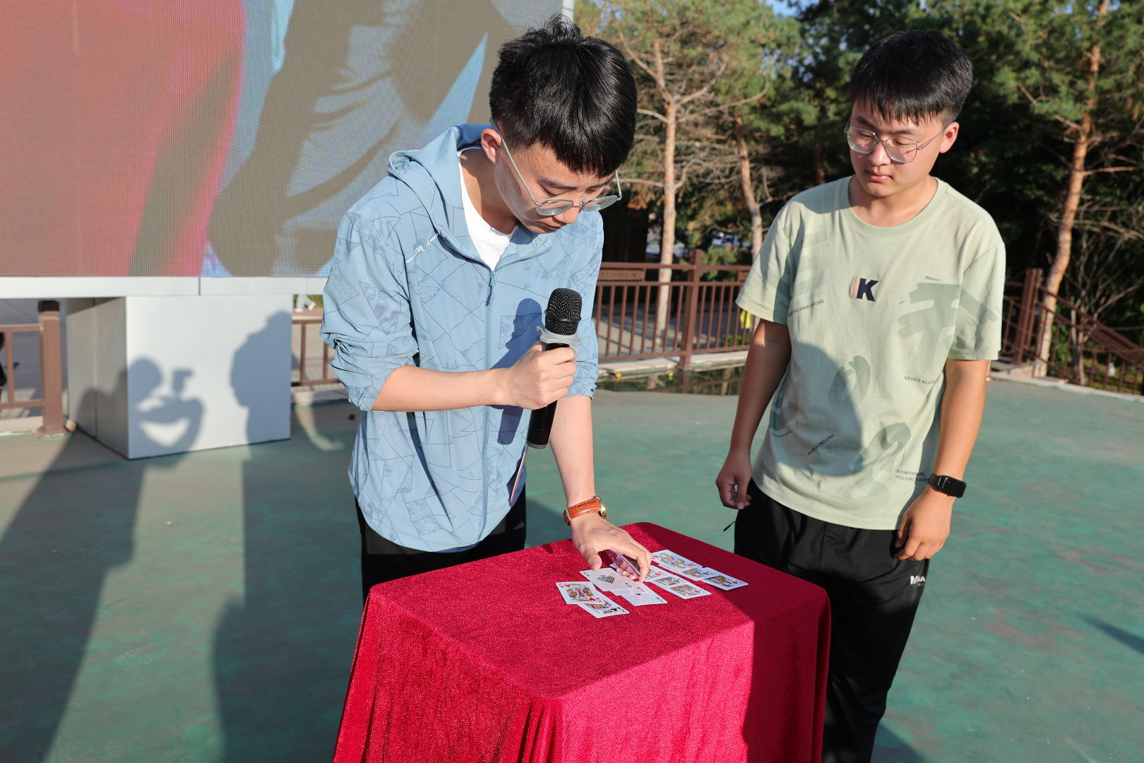 延续着社团寻踪的活力氛围,下午4时,体育文化休闲广场成了2025级新同学展示自我的舞台,“萌新秀・绽放时刻”活动在此热闹开场。“在报到前通过校团委的微信公众号了解到这个活动,我就决定要表演一个魔术,希望同学们能够喜欢!”候场时,应化25-1班朱思宇说。
