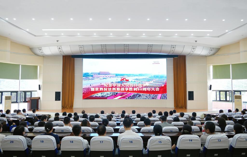 为深切缅怀抗战先烈、大力弘扬伟大抗战精神,进一步点燃全校干部师生的爱国热情与民族自豪感,学校党委对此次阅兵收看活动高度重视,提前统筹部署。各部门、各单位迅速响应,有序落实集中收看安排。全体校领导与机关干部职工齐聚办公楼报告厅观看;2025 级新生在军训场地整齐列队,身着迷彩服的他们身姿挺拔,在铿锵的阅兵旋律中感受历史厚重与国家力量;同时学校还开放了多个电视转播点,方便师生收看。
