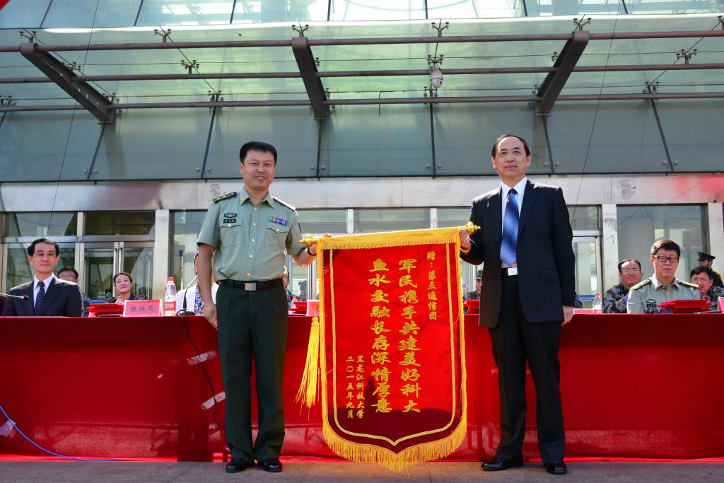 随后,校长武俊峰向中国人民解放军65045部队赠送了锦旗;大学生仪仗队进行了精彩的军事技能汇报表演。