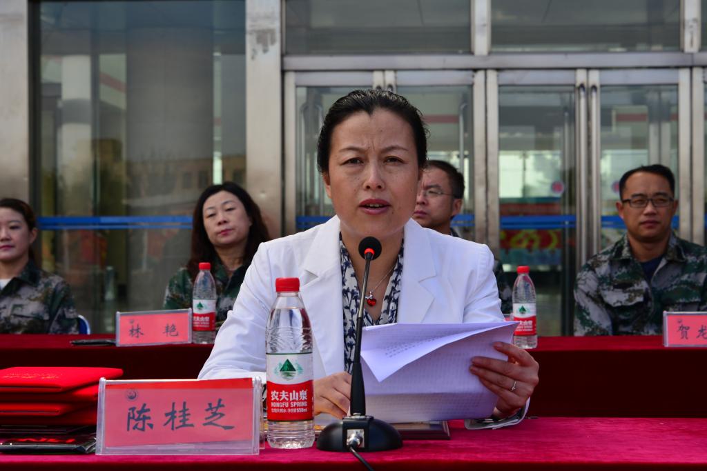 党委常委、副校长陈桂芝对军训工作全面总结,她向支持学校军训工作的各级领导和同志表示感谢,向受阅的全体教官和同学表示慰问,向在军训中受表彰的先进集体和个人表示祝贺。她指出,军训是大学生活的第一课,2015级学生军训工作在学校领导高度重视下,在学院领导、辅导员、班主任和各部门的密切协作下,部队教官科学施训,同学们磨练意志,积极参与军训,训练效果良好。她希望同学们继承并发扬解放军的好思想、好传统,践行“求真求实、创业创新”的校风和“尊师守纪,勤奋进取”的学风,争做思想道德素质高,基础理论扎实,知识面宽,实践能力强,具有创新创业精神的新时期合格大学生,为全面推进学校的内涵建设贡献力量。