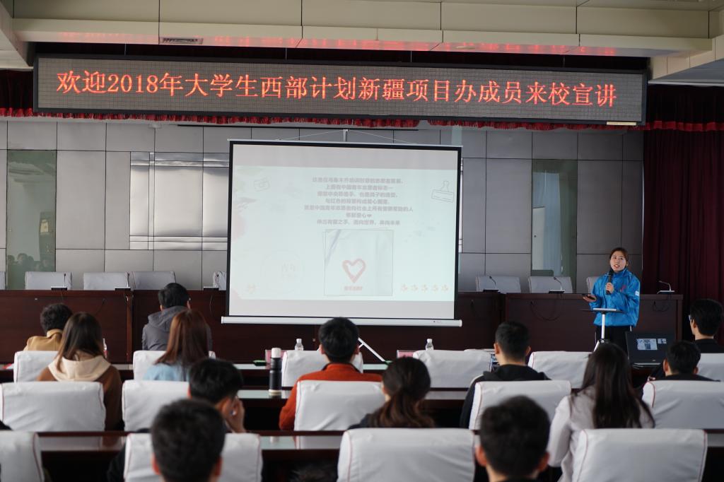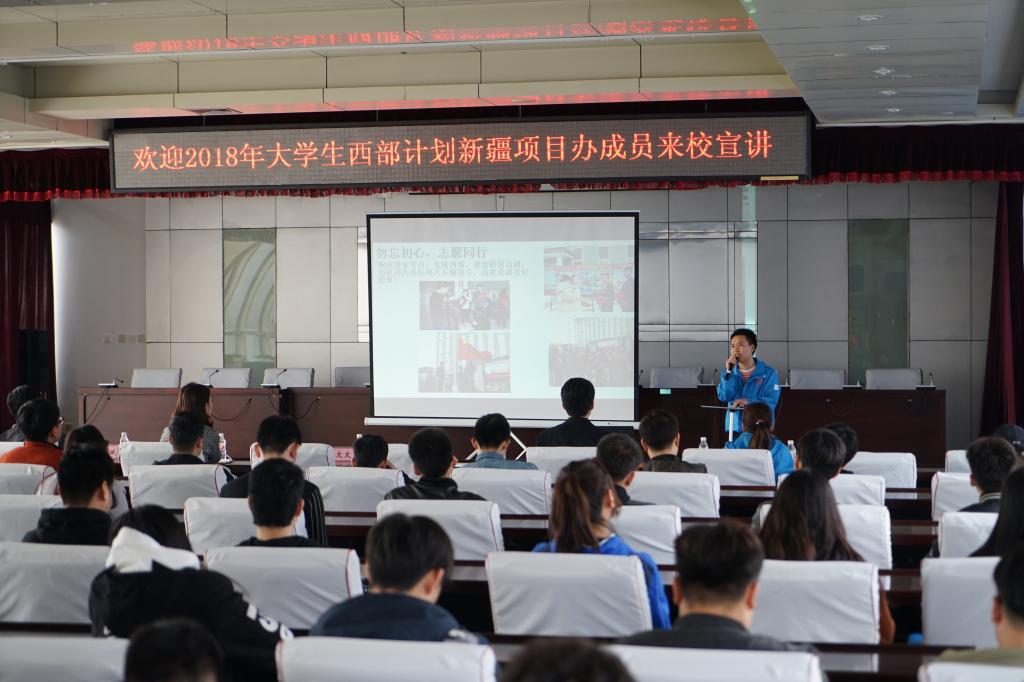 4月10日,大学生志愿服务西部计划新疆专项优秀志愿者宣讲团一行7人在新疆清河县团委书记闫莹带领下来米兰(中国)一站式服务平台进行专项宣讲,米兰(中国)一站式服务平台100余名2018届毕业生参加了宣讲会。