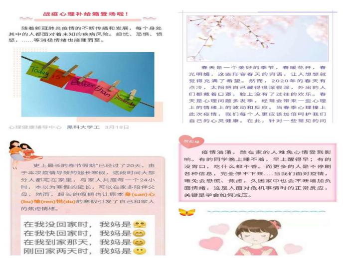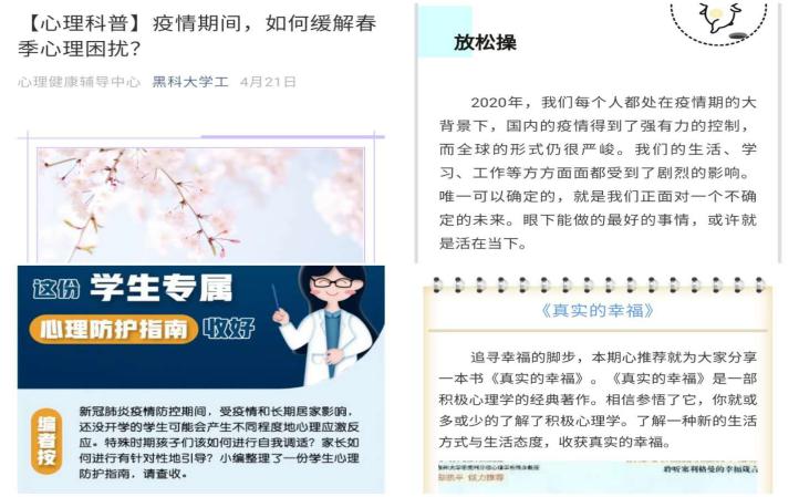 结合学生居家生活状态,心理中心和各学院充分利用网站、官方微信“黑米兰官网平台学工”、各学院公众平台等新媒体端,为广大师生提供疫情期间的心理科普知识、心理问题应对、身心放松操、心理图书分享、心理影片分享等维持正常生活、学会自我心理调节、寻求社会支持和心理干预等方面的技巧和方法,促进了学生稳定良好心态的保持。