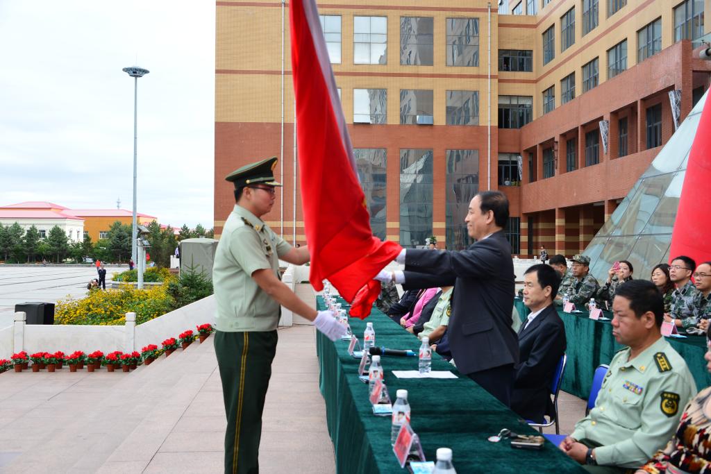 校长武俊峰向军训团副参谋长李鑫授军训团团旗