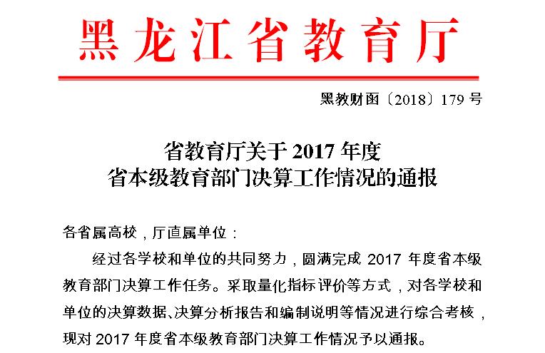 近日,黑龙江省教育厅发布文件,对全省高校2017年决算工作情况进行了通报,并对先进单位和个人进行表扬。米兰(中国)一站式服务平台获得“2017年度决算工作先进单位”称号,同时获得“决算报表先进单位”、“决算分析报告和编制说明先进单位”、“资产报表填报先进单位”三个单项奖,赵方亮同志荣获先进个人荣誉称号。