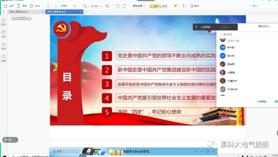 疫情防控期间,各学院充分发挥组织优势,组织全校青年学生开展以“学习《习近平谈治国理政》第三卷”为主题的“四史”学习教育活动,领会精髓要义,紧密联系实际,把学习党的创新理论同学习马克思主义基本原理结合起来,同学习党史、新中国史、改革开放史、社会主义发展史结合起来,同把握和推进新时代伟大实践结合起来,做到学思用贯通、知信行统一。提高政治能力、强化政治担当,把学习成效转化为增强“四个意识”、坚定“四个自信”、做到“两个维护”的具体行动,转化为应对风险挑战、推动事业发展的能力和水平,乘势而上全面建设社会主义现代化国家的伟大实践。采取校院两极线上教育方式,积极采取形式多样、青年喜闻乐见的学习方式深入开展主题班会、团日、党日等活动,把鲜活丰富的“四史”内容融入主题教育。