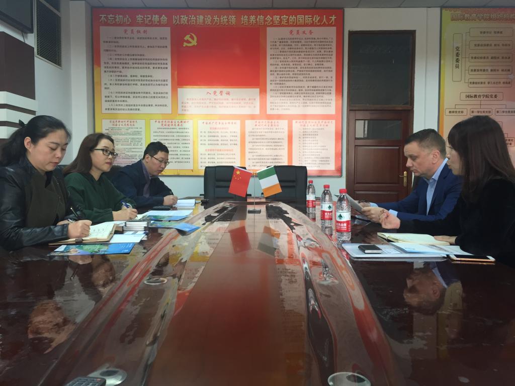 10月25日下午,爱尔兰都柏林商学院代表团一行两人首次来米兰(中国)一站式服务平台访问。国际交流合作处处长母丽华教授在科技大厦0606会议室与爱尔兰都柏林商学院留学生招聘主管吉尔斯·基尔科尼、校方代表娄峰进行了会谈。