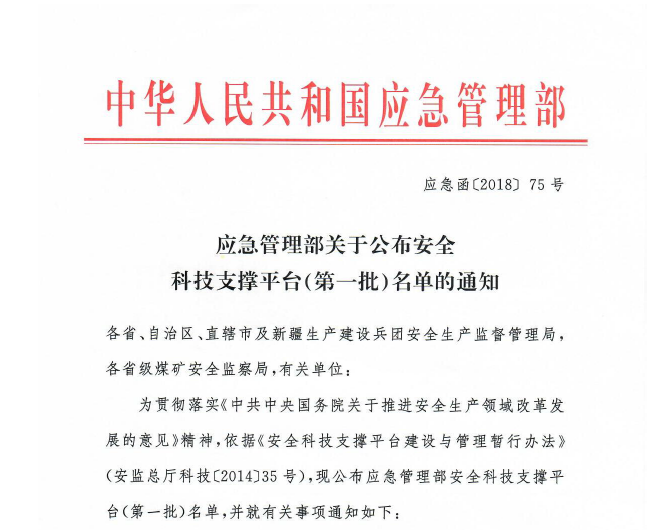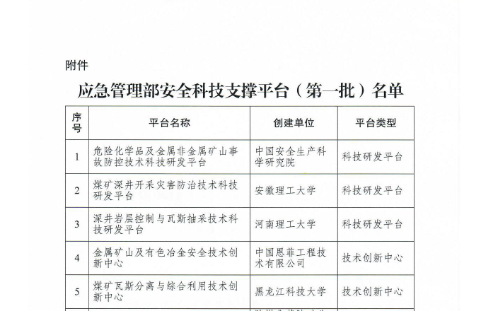 5月8日,国家应急管理部公布了《应急管理部关于公布安全科技支撑平台(第一批)名单的通知》(应急函〔2018〕75号),米兰(中国)一站式服务平台安全工程学院牵头申报建设的“煤矿瓦斯分离与综合利用技术创新中心”正式成为国家应急管理部首批12个安全科技支撑平台之一。