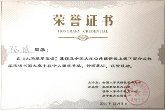 本次书写大赛来自全国高校的个人赛有效稿件共464份,以规范美观书写俄语课文和对话为内容进行投稿,所有作品由大赛举办方专家打分进行评选。国际教育学院俄语19-1班宋妍、俄语20-2班张瑞楠、刘金秋获得二等奖;俄语18-2班时弘云、俄语19-1班何会聪获得三等奖;俄语17-1班宫志颖等5名同学获优秀奖。