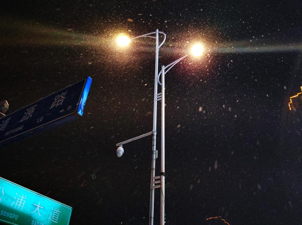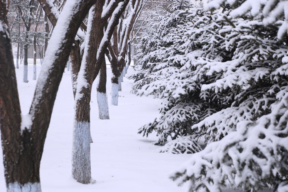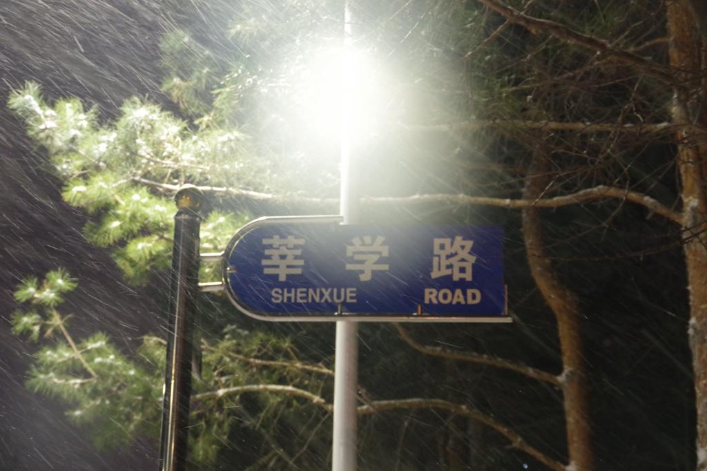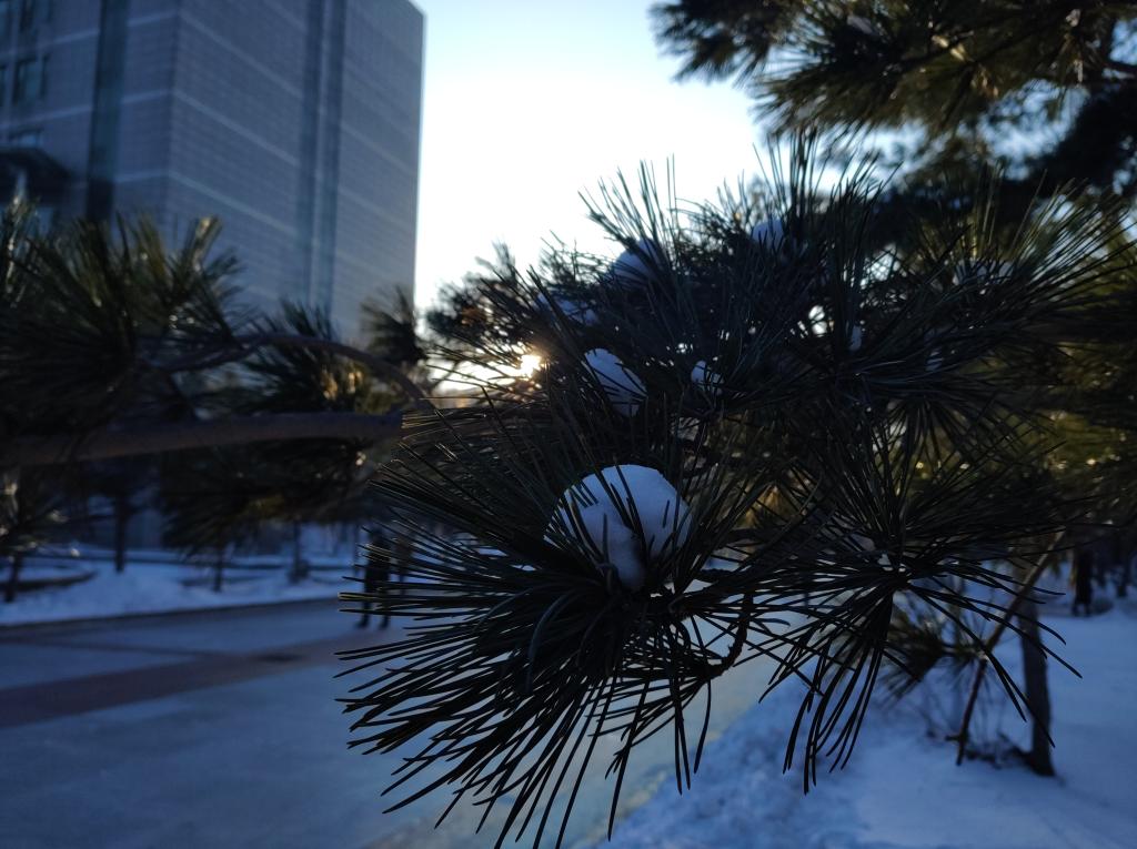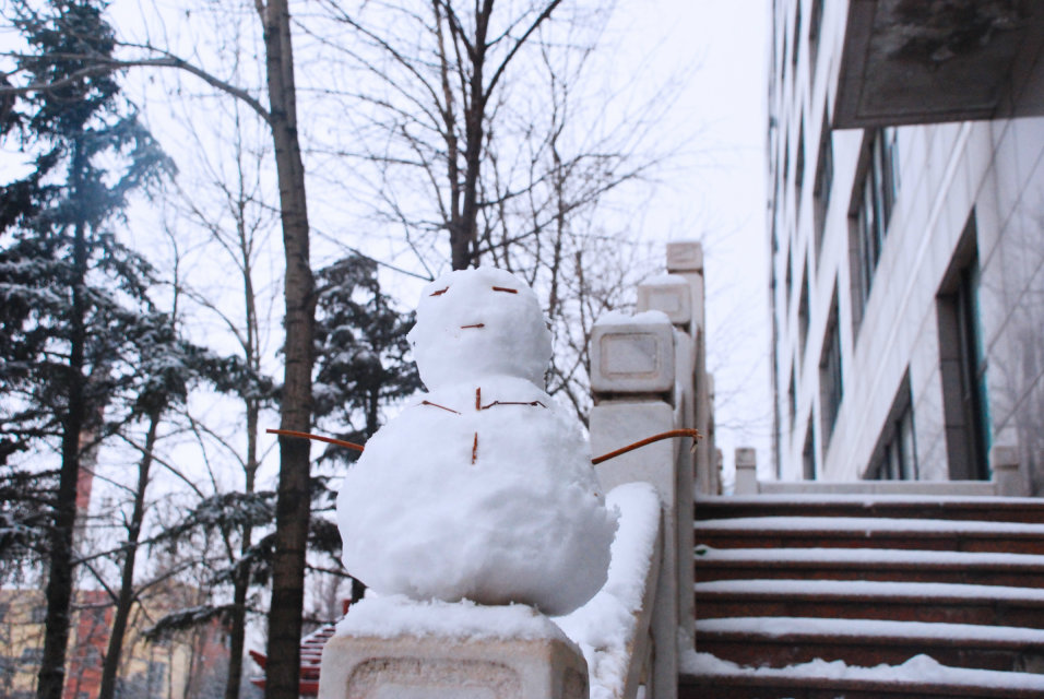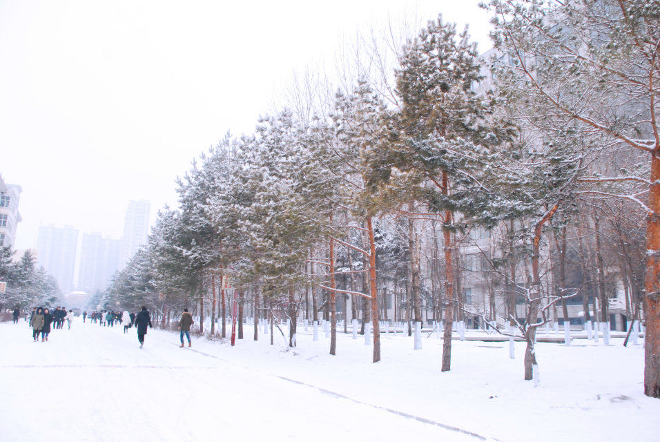 大雪与校园不期而遇,道路两旁的树木,被薄雪染白了双鬓,更显冬天特有的活力。