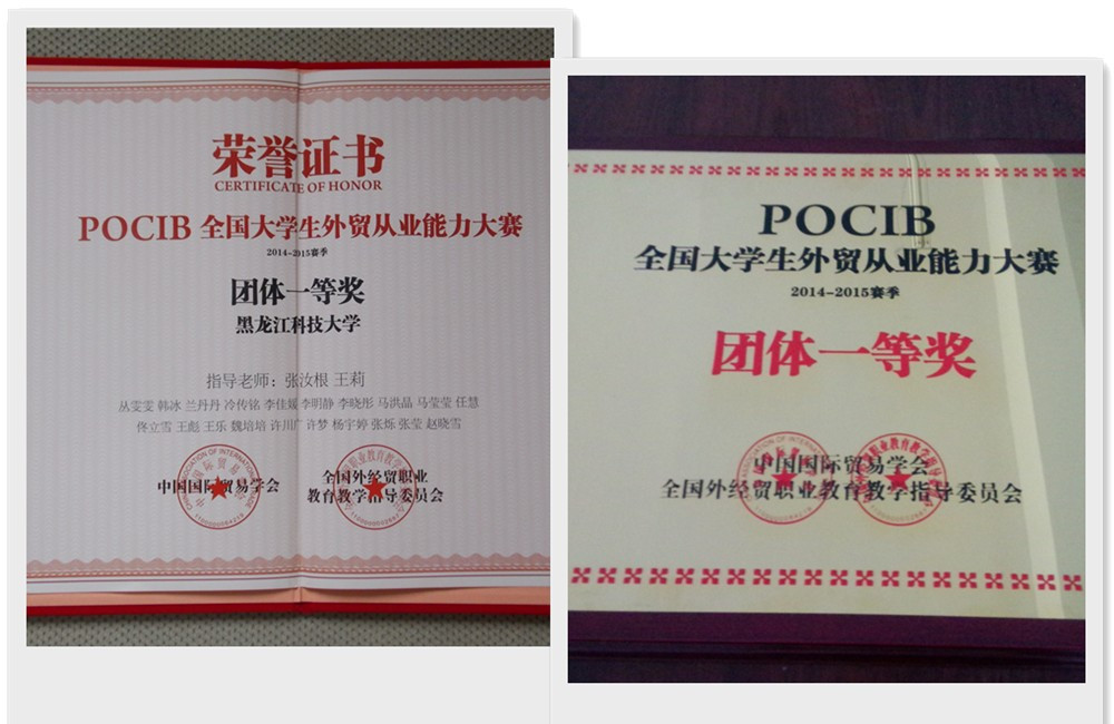 4月10日至4月29日,经济学院副院长张汝根老师和国贸系主任王莉老师带领该院12级国际经济与贸易专业的20名学生,参加了第四届 POCIB 全国大学生外贸从业能力大赛。以总分1874.38分获得团队一等奖,并收获个人一等奖等15项荣誉,创黑龙江省参赛学校历年最好成绩。