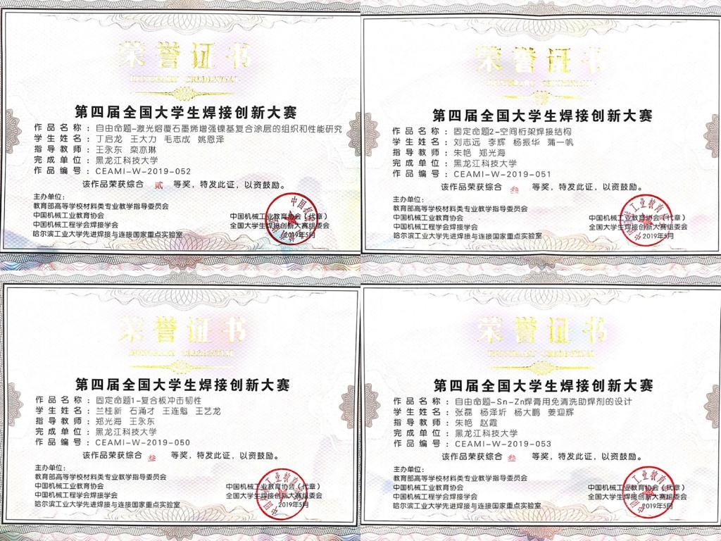 经大赛组委会初赛选拔,共有来自哈尔滨工业大学、天津大学、江苏大学、哈尔滨理工大学、米兰官网平台等53所省内外高校的163支参赛队伍进入决赛,经过激烈角逐,米兰(中国)一站式服务平台材料科学与工程学院焊接技术与工程专业的4支参赛队在王永东、郑光海、朱艳等焊接教学团队教师的指导下取得佳绩,焊接15级丁启龙同学的团队作品《激光熔覆石墨烯增强镍基复合涂层的组织和性能研究》获得自由命题组二等奖,焊接15级张磊同学的团队作品《Sn-Zn焊膏用免清洗助焊剂的设计》获得自由命题组三等奖,焊接15级刘志远同学的团队作品《空间桁架焊接结构》和焊接15级兰桂新同学的团队作品《复合板冲击韧性》获得固定命题组三等奖。