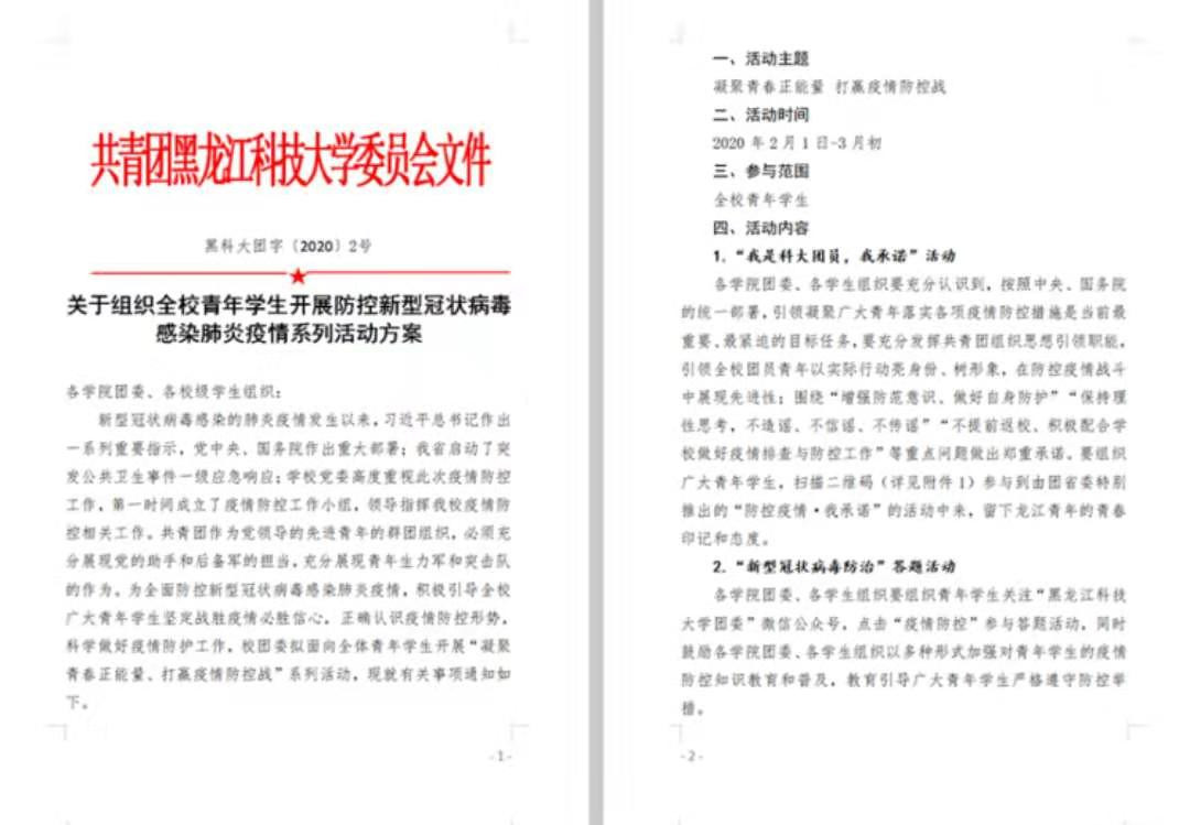 听从党的号令,坚持全团动员。面对疫情防控的严峻形势,全校各级团组织发扬“党有号召、团有行动”的优良传统,坚持全团动员,做到组织动员到支部、发挥作用靠支部,在学校党委的统一指挥下,科学、有序开展疫情防控工作。校团委面向全校各级团学组织下发了《关于组织全校青年学生开展防控新型冠状病毒感染肺炎疫情系列活动方案》,积极引导全校广大青年学生坚定战胜疫情必胜信心,正确认识疫情防控形势,科学做好疫情防护工作。