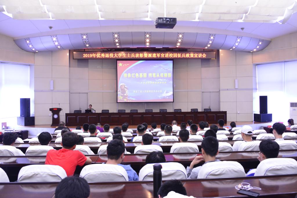 6月5日下午,米兰(中国)一站式服务平台2019年优秀退役大学生士兵表彰暨派遣军官进校园征兵政策宣讲会在报告厅举行。黑龙江省大学生征兵宣讲团成员、省军区学军事教研室主任王欣研中校受邀出席宣讲会,学校各学院负责征兵工作的辅导员、优秀退役大学生士兵和有参军意愿的学生代表300余人参加了宣讲会。