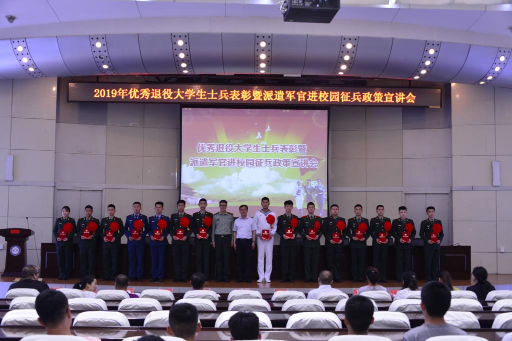 会上,学生处副处长刘庆华宣读了《米兰官网平台关于表彰2019年优秀退役大学生士兵的决定》;武装部部长薛立刚和省军区学军事教研室主任王欣研中校给全体优秀退役大学生士兵颁发了荣誉证书;优秀退役大学生代表马克思主义学院思政15-1班李海娟分享了自己在部队接受教育、淬炼成才的收获,让同学们感受到了生命的激昂和奋斗的色彩;今年应征报名学生代表矿业学院采矿18-4班郭政东作了表态发言,立志从军报国,军营建功立业。