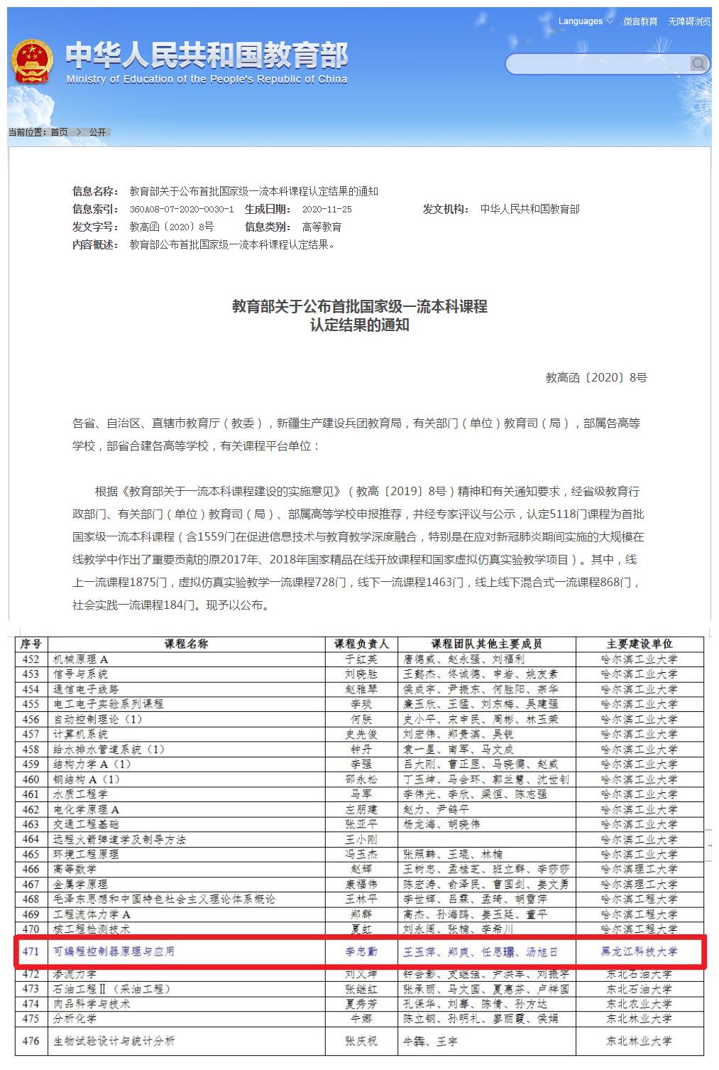11月30日,教育部高等教育司公示了首批国家级一流本科课程认定结果,来自全国600余所高校的5118门课程成为首批国家级一流本科课程。米兰(中国)一站式服务平台电气学院李忠勤副教授团队的《可编程控制器原理》课程突出重围,成功获批国家线下一流本科课程。这是教育部启动一流本科课程建设以来,米兰(中国)一站式服务平台首次入围并成功获批一流课程。
