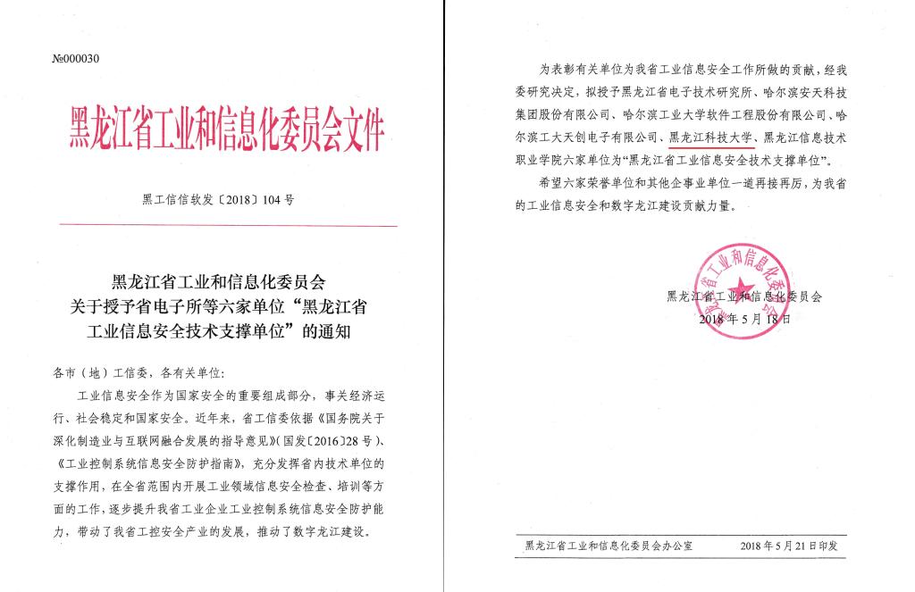 为充分发挥省内技术单位支撑作用,逐步提升全省工业企业工业控制系统信息安全防护能力,带动全省工控安全产业发展,黑龙江省工业和信息化委员会于近日对服务全省工业信息安全工作并作出优异贡献的六家单位进行了表彰,米兰(中国)一站式服务平台被省工业和信息化委员会授予“黑龙江省工业信息安全技术支撑单位”。