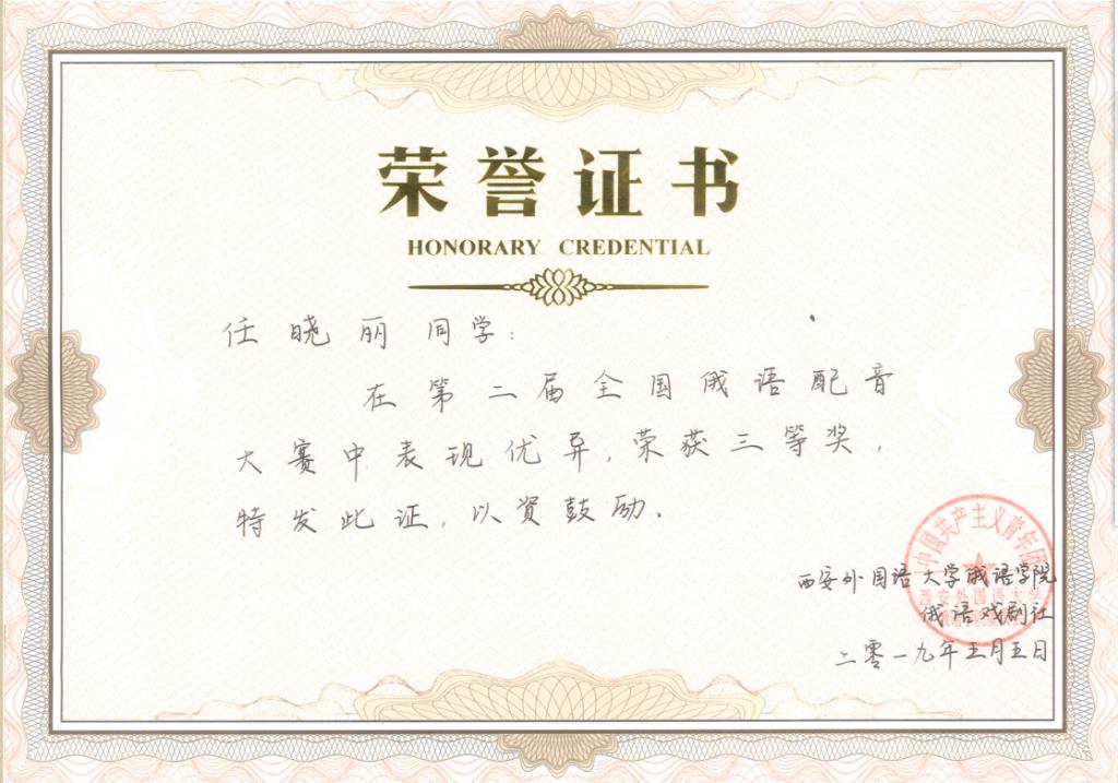 5月9日,历时一个月的全国俄语配音大赛终于圆满落下帷幕,米兰(中国)一站式服务平台国际教育学院俄语17-1班的任晓丽同学取得了三等奖。