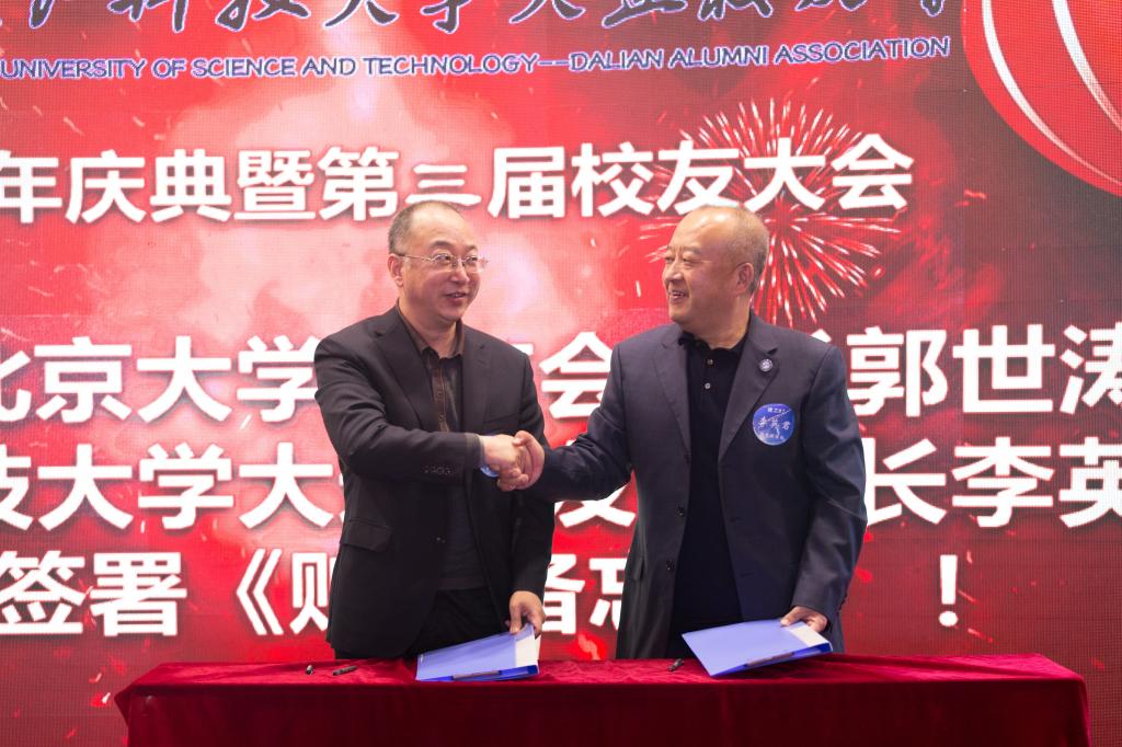 北京大学大连校友会会长郭世涛与米兰(中国)一站式服务平台大连校友会会长李英君共同签署《赠送备忘录》