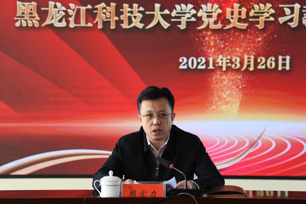 周宏力指出,要认真贯彻落实中央和省委决策部署,准确把握党史学习教育的目标任务。紧扣学懂弄通做实习近平新时代中国特色社会主义思想这条主线,教育引导全校广大党员、干部树立正确的党史观,切实做到学史明理、学史增信、学史崇德、学史力行的“十六字”目标要求。紧紧围绕落实习近平总书记“六个进一步”的重要要求,准确把握重点学习内容,要深刻领悟党的光辉历程和伟大贡献;要深刻领悟党的领导地位和坚强核心;要深刻领悟党的性质宗旨和初心使命;要深刻领悟党的理论成果和思想伟力;要深刻领悟党的革命精神和优良传统;要深刻领悟党的历史经验和政治优势;要深入学习党领导黑龙江人民奋斗前行的辉煌历史;要全面回顾党领导中国特色社会主义大学发展建设的历史和巨大成就。并以此为契机,要把党史学习教育融入育人全过程、融入办学治校全过程,通过党史学习教育谋大事、干实事、解难事、长本事,切实把学习成果转化为工作动力和成效,全面提高政治能力和办学治校能力,汇聚合力推动学校高质量发展。