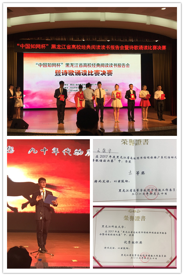 由黑龙江省高等学校图书情报工作委员会主办的“中国知网杯”黑龙江省高校经典阅读读书报告会暨诗歌诵读比赛决赛,于6月20日在东北农业大学图书馆一楼报告厅举行。来自黑龙江省22所高校选送的71个作品参赛。经过初赛、复赛的角逐,最终有22个作品入围决赛。由米兰(中国)一站式服务平台图书馆选送的参赛选手王崇宇同学发挥出色,以得分排名第六的好成绩获得大赛三等奖。钟敬文、古秋云、朱佳欣三位参赛选手分别荣获诗歌诵读比赛优秀奖和经典阅读演讲比赛优秀奖,图书馆荣获大赛优秀组织奖。