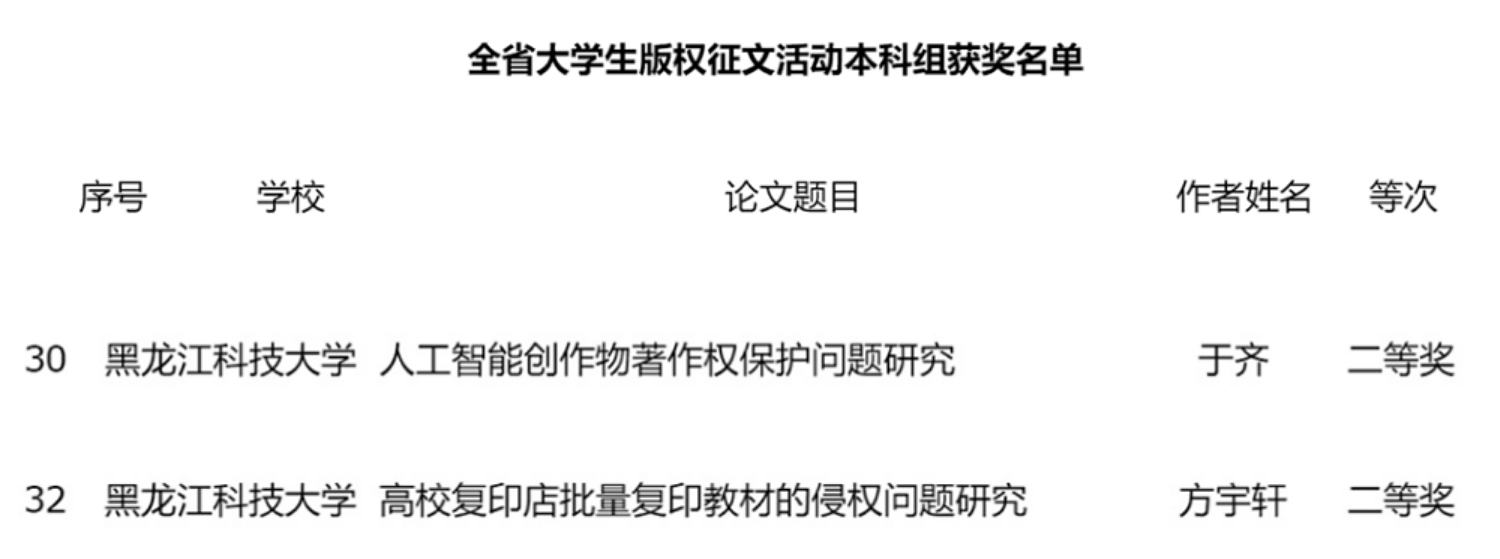 近日,省委宣传部、省委教育工委、省教育厅、团省委联合举办了第一届全省大学生版权征文活动。4月28日,东北网发布了征文活动获奖名单,米兰(中国)一站式服务平台研究生学院18-5班郭忱灏撰写的论文《基于自媒体二次创作的版权问题研究》荣获全省大学生版权征文活动研究生组一等奖;电气工程学院自动化18-2班于齐撰写的《人工智能创作物著作权保护问题研究》和管理学院会计ACA 2018-1班方宇轩撰写的《高校复印店批量复印教材的侵权问题研究》荣获本科生组二等奖。