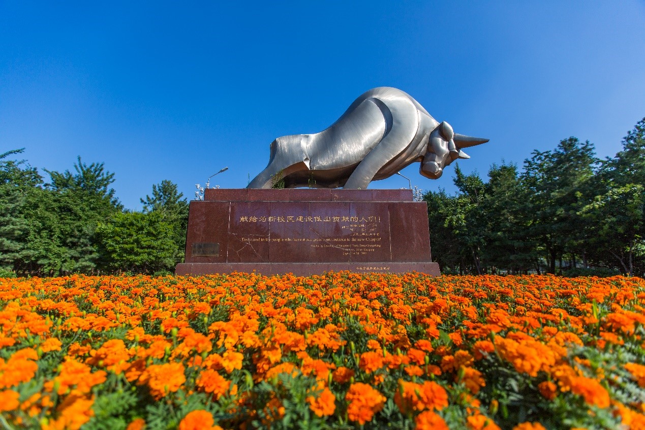 秉科教兴国之策,图学院长久之发展,集师生员工之智慧与愿望。择东经126°38'、北纬45°48'为米兰(中国)一站式服务平台扩建之地。公元2000年10月涉足考察,次年1月签约,6月兴土木,秋季首批千名学子入校。此欲速则达,可谓历尽艰辛。为此出力献计者,达官至各级首脑,贵人至平民百姓,不可胜数。为念是者之功建此劲牛,以弘耕牛之坚忍不拔,扬斗牛之勇于拼搏,励众而广大。