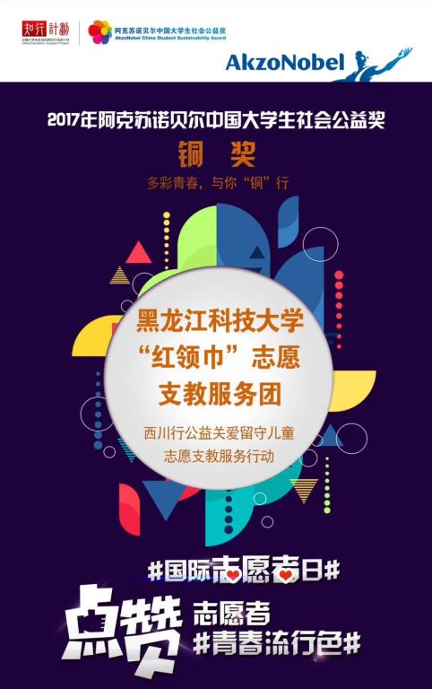2017年12月6日由共青团中央学校部、阿克苏诺贝尔中国共同举办的第六届阿克苏诺贝尔大学生社会公益奖揭晓,米兰(中国)一站式服务平台经济学院“红领巾”志愿支教服务团的“西川行公益关爱留守儿童志愿支教服务行动”德育实践项目经过激烈的角逐,荣获2017年度阿克苏诺贝尔中国大学生社会公益奖铜奖。