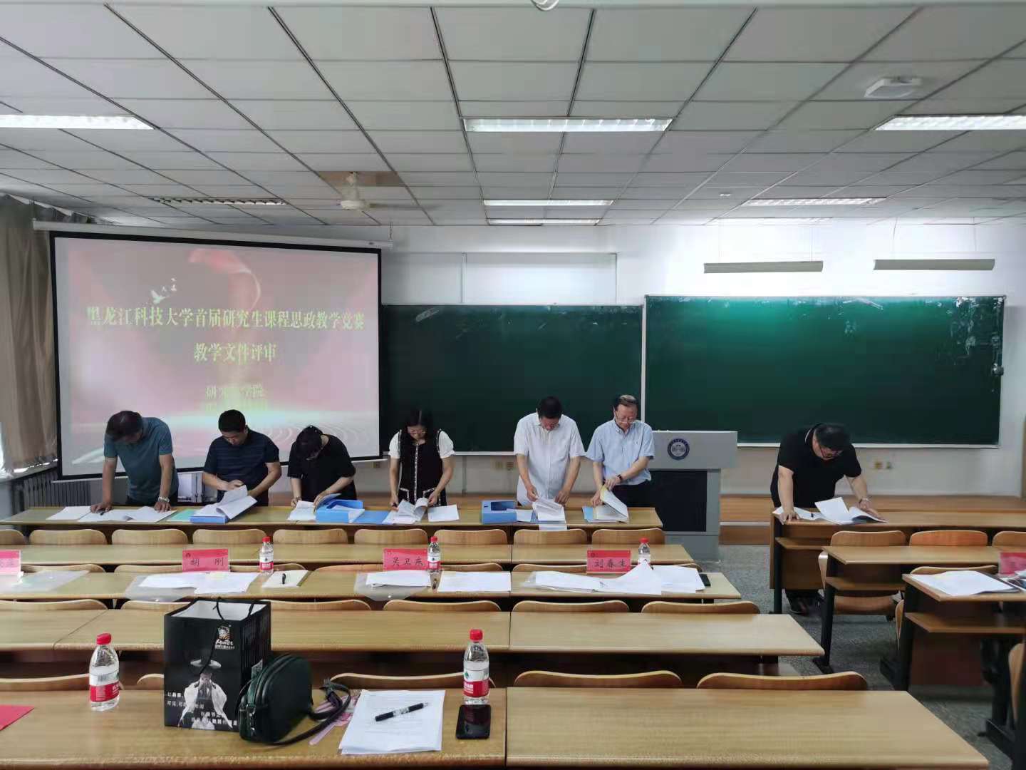 此次竞赛由校副总督学刘春生教授,教学质量评估中心副主任吴卫东教授,研究生学院党委书记王维杰研究员,研究生学院院长胡刚教授,马克思主义学院院长冯德军教授,人事处副处长曹景萍教授,省课程思政教学名师机械工程学院副院长唐庆菊教授担任评委。