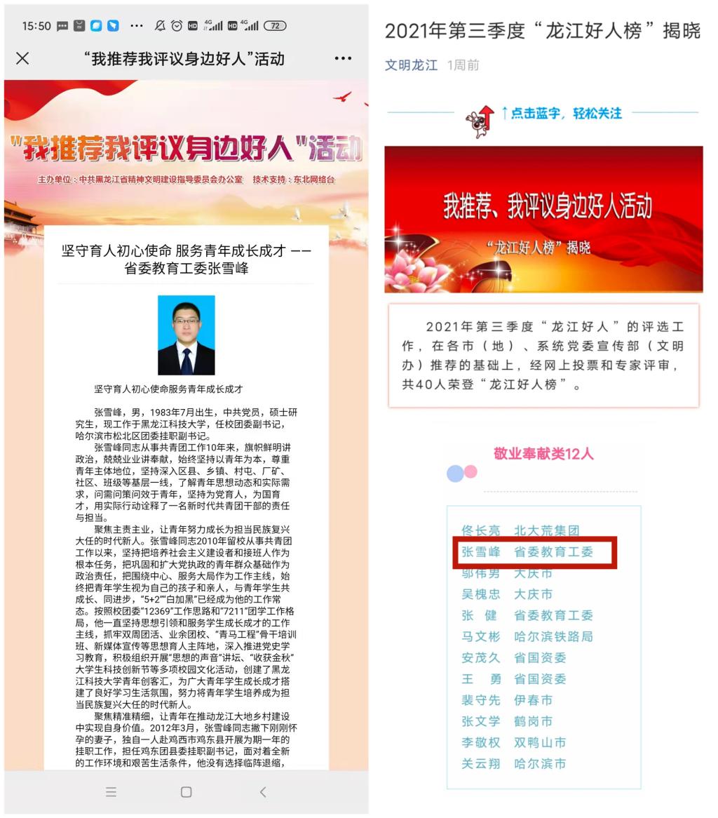 近日,由中共黑龙江省精神文明建设指导委员会办公室主办的“我推荐我评议身边好人活动”结果揭晓,省委教育工委以及学校共同推荐的米兰(中国)一站式服务平台张雪峰同志被评为2021年第三季度敬业奉献类“龙江好人”。