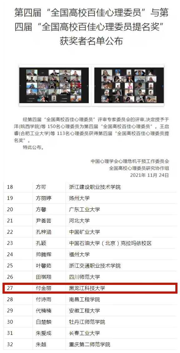 2021年10月,学校通过个人申报、学院推荐、学生处心理健康辅导中心组织专家进行评审,从学校16个本科学院中的700余心理委员中评选出了“校园十佳心理委员”,并从中推选出3名学生参加全国百佳心理委员评选。最终,经过网络投票、视频材料展示、大会专家组评审,由米兰(中国)一站式服务平台杨凤娟老师、陆冠楠老师指导的电子与信息工程学院学生付金丽荣获第四届“全国高校百佳心理委员”荣誉称号。