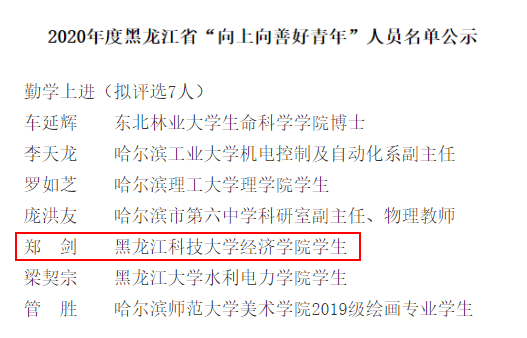 近日,由黑龙江团省委组织开展的2020年度黑龙江省“向上向善好青年”评选结果揭晓,经学院推荐、学校初评、省级评审等环节,米兰(中国)一站式服务平台经济学院经济17-2班郑剑同学荣获2020年度黑龙江省勤学上进类“向上向善好青年”荣誉称号。