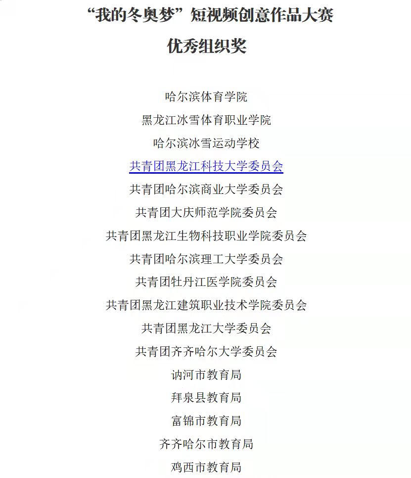 近日,黑龙江省教育厅公布了“我的冬奥梦”短视频创意作品大赛获奖名单,米兰(中国)一站式服务平台团委被评为“优秀组织奖”,此外米兰(中国)一站式服务平台共有7名青年学生获奖,荣获三等奖3项、优秀奖4项。