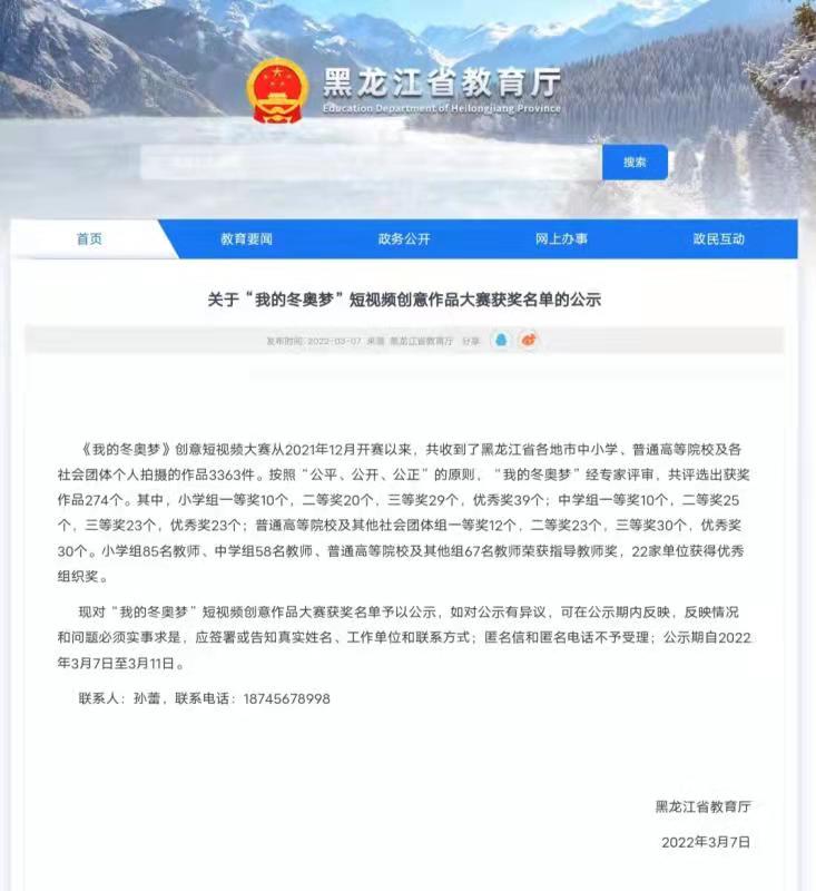“我的冬奥梦”短视频创意作品大赛获奖名单