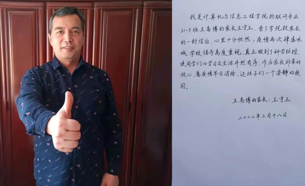 哈尔滨市疫情防控形势严峻,作为父母很是担心孩子的安全和健康,今悉贵校学院致家长的一封信,颇受感动。学校的疫情防控工作扎实有效,学校的封闭管理让我深感欣慰。师生同吃同住,餐饮供给充足,住宿条件优越,核酸采集规范有序,心理疏导缓解压力,作为学生家长看在眼里暖在心头。作为一名乡镇当党员干部,我也坚守在抗疫一线,非常理解学校学院为防疫做出的努力,我会积极引导孩子主动配合学院做好疫情防控,疏导孩子封校压力,及时掌握近期孩子学习生活状态,我坚信,在全校师生的共同努力下,战胜疫情,曙光就在前方!
