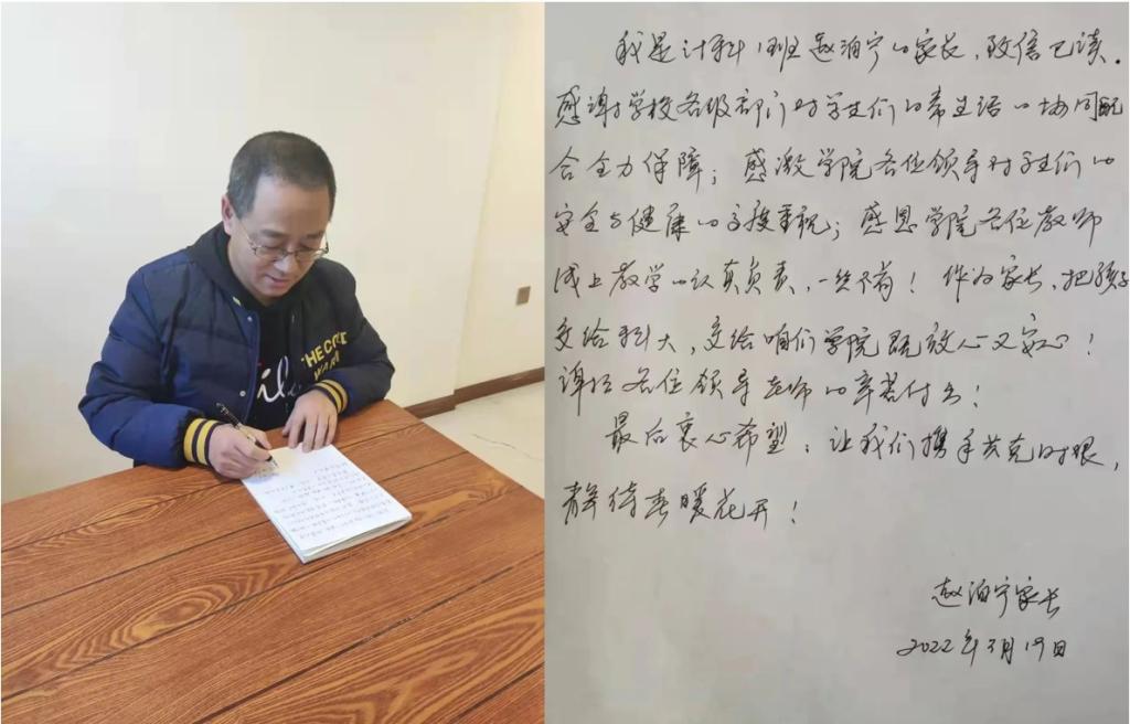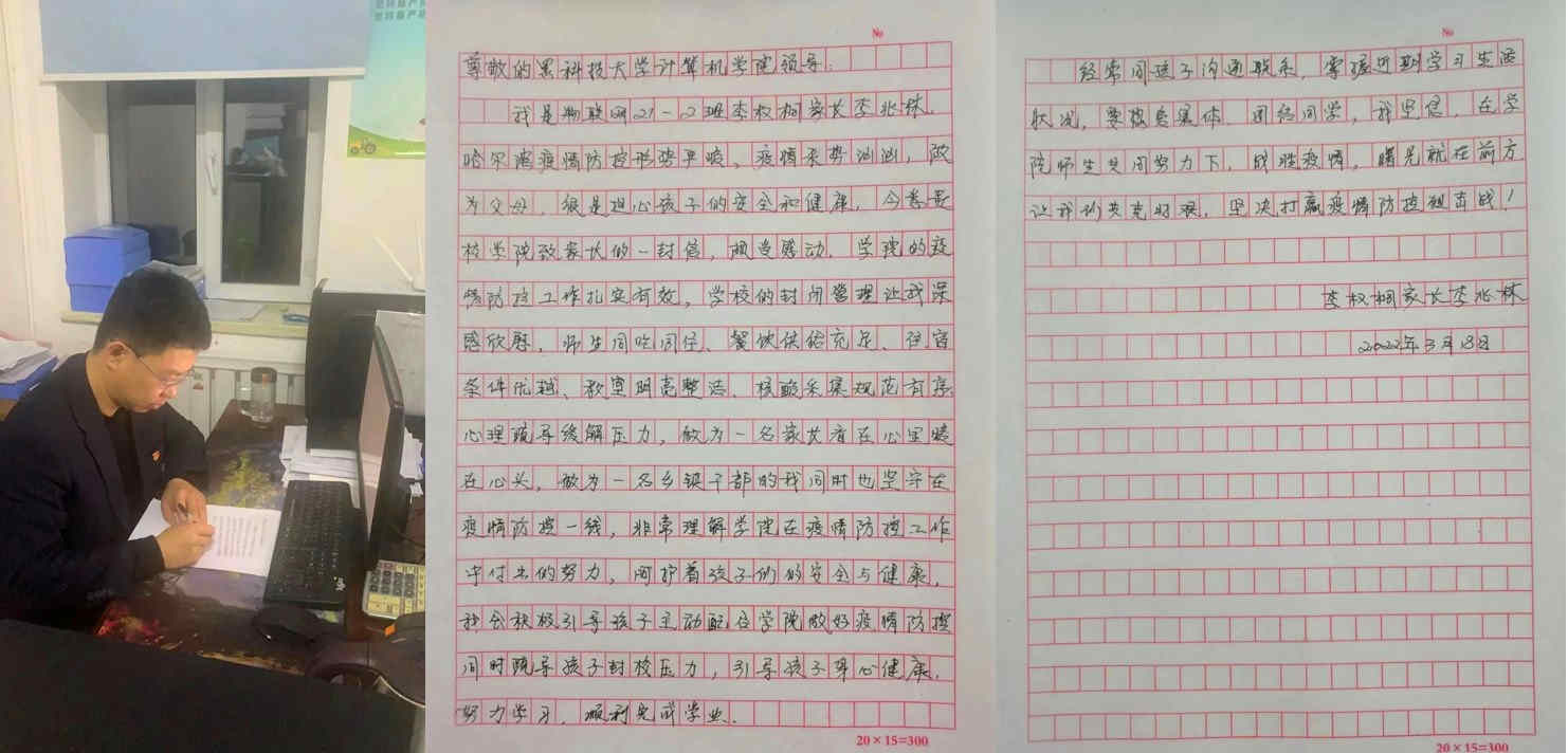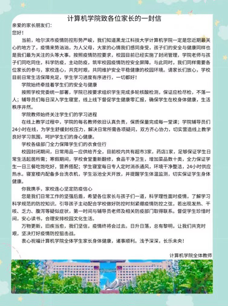 近期,国内多地出现本土疫情,学校为保证学生的生命安全实施封闭管理,为了让学生家长安心放心,计算机学院于3月18日发布《计算机学院致各位家长的一封信》,向各位家长阐述目前哈市和学校的防疫要求,展示学校学院为广大学生提供的完备后勤保障,受到学生家长一致好评,3月19日学生家长纷纷给学院师生回信,家校连心,共克时艰,共同筑牢安全平稳健康的校园疫情防护网。
