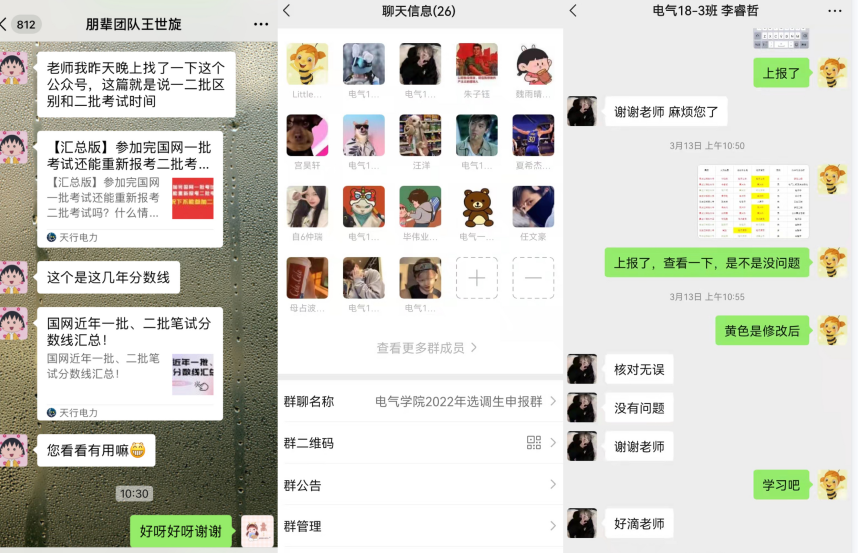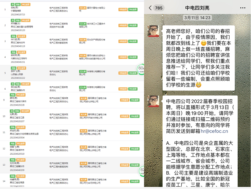 发挥优势、全力以赴,就业质量提升“高”。一是指派专业教师、辅导员负责指导国网二批考试和考研复试及调剂工作,确保学生实现预期目标,目前国网签约22人,考研上线率为11.49%。二是与用人单位建立信息库,对学生认可度较高的企业勤沟通和重交流,努力探索合作新模式,其中中国电子系统工程第四建设有限公司在秋招已签约18人的基础上,春招之际给学生预留编制,重点照顾米兰(中国)一站式服务平台生源。三是以做好毕业设计和开启毕业生德育答辩为依托,突出专业特色,夯实专业基础,提升专业素养,强化专业能力,力促学生高质量就业。
