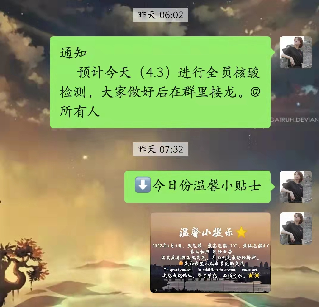 雷打不动,早上六点的温阳准时把我唤醒。充实的一天将要开始。洗漱、吃饭、早读,将生活嚼得有滋有味,把日子过得活色生香,往往靠的不只是嘴,还要有一颗浸透人间烟火的心啊,“哦,快8:30了,做核酸的时间到了。”马不停蹄,直赶宿舍,“@所有人,出来啦,出来啦,出来做核酸啦,带好口罩,间隔一米,左扫码,右检测”“都穿厚点哦”。当班群里的接龙到第28人时,我明白,今天的核酸任务已然完成。
