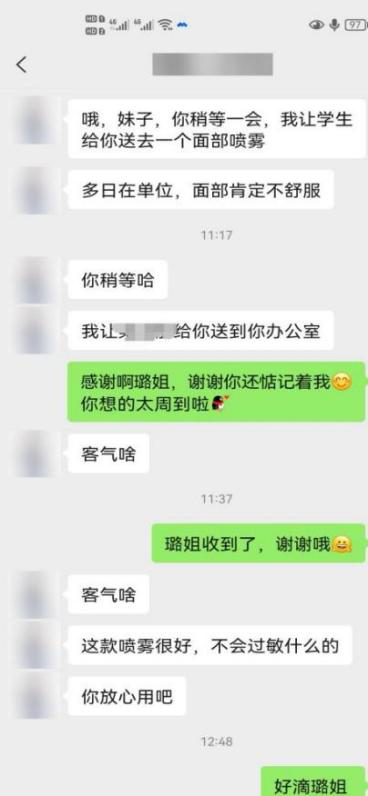 11:00,汉语言专业系主任李璐老师发来了微信,她让我在办公室稍等一会。她考虑到我多日在校,特意让学生送来了一瓶喷雾。感谢所有惦念着我的家人、同事、朋友们,我一切都好。