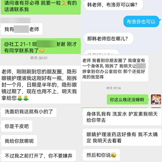 回寝后意外地收到了一个袋子,这个袋子里的东西都是学生们向我伸出的“援助之手”。在得知我各种“空瓶”后,洗面奶、洗发水、护发素、隐形眼镜护理液、身体乳、卸妆棉都来了…我感受到了学生们对辅导员老师的关爱。老师守护着学生,但学生何尝不是用他们的方式在爱护着老师呢。
