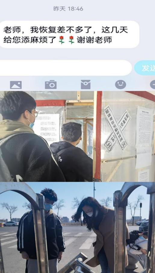 12:00,在校外就医的学生和陪护他的室友将要返回学校,我到南门接这两名同学。在校外的王伟强副书记、张利南老师也提前到医院等待他们,看到学校专车把学生送到南门,学生进到学校并顺利交接给我后,他们才放心地离开。